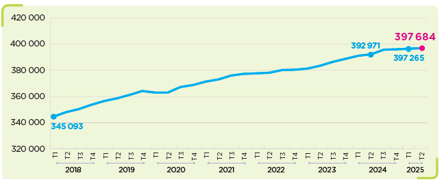 Sur an glissant, la tendance s’oriente vers une hausse de l’emploi (+ 1,2 %, + 4 700 salariés), toutefois plus modeste que les années passées. Depuis 3 trimestres désormais, la progression de l’emploi s’est fortement ralentie. De plus, l’alternance avait moins progressé à la rentrée 2024 par rapport aux années précédentes. Même si l’emploi salarié continue de légèrement progresser sur le premier semestre de l’année 2025, cette évolution est nettement en deçà de celle observée en 2024 (+ 0,2 % contre + 0,9 %).